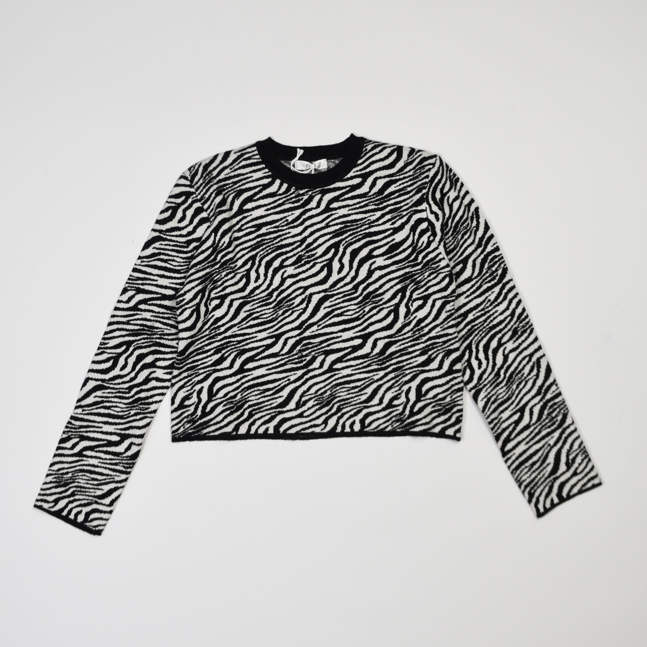 Maglione a maniche lunghe in morbida maglia, caratterizzato da una vivace fantasia zebrata bianco e nero con bordature a contrasto. Un modello trendy e deciso, perfetto per dare un tocco grintos